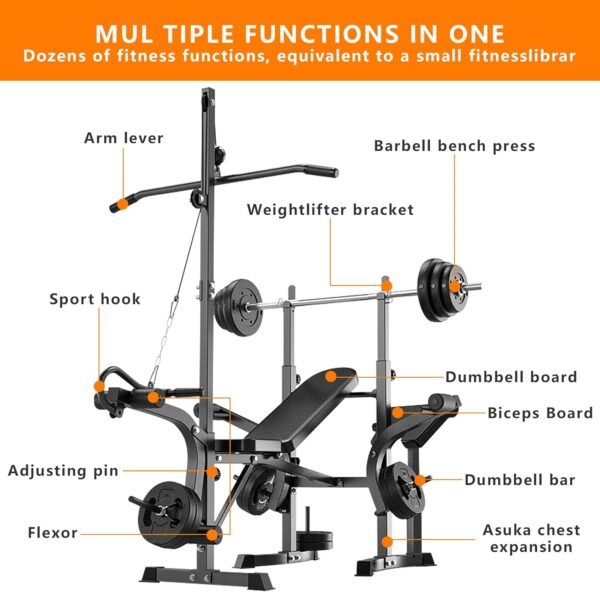 - 【Multi-Function Weight Bench】 weight all-in-one fitness equipment includes an adjustable leg developer, a barbell rack, and a weight bench, allowing you to do lever bench press, one-arm dumbbell row, dumbbell press, leg flexion & extension, sit-ups and more. A variety of workouts to help you get an effective full-body exercise.