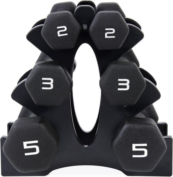 - WHAT’S INCLUDED – A convenient dumbbell storage rack with 3 pairs of dumbbells in 2-pounds, 3-pounds and 5-pounds
