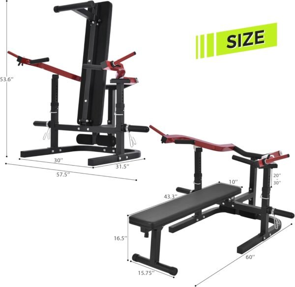 - CONVENIENT STORAGE: This elegantly designed bench press is foldable, allowing for easy horizontal or vertical folding of the flat bench for compact storage. The overall dimensions are 60×57.5 inches, making it suitable for various home environments.